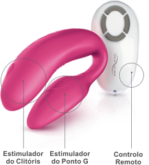 Como se pode facilmente compreender pela imagem, o We-Vibe possui duas extremidades com funções diferentes. Ambas as extremidades são vibratórias podendo o tipo de vibração e respectiva intensidade serem reguladas pelo utilizador através de um prático comando à distância sem fios. Recomendamos por isso que não deixe o comando ao alcance das crianças e de terceiros quando tiver o We-Vibe dentro de si...